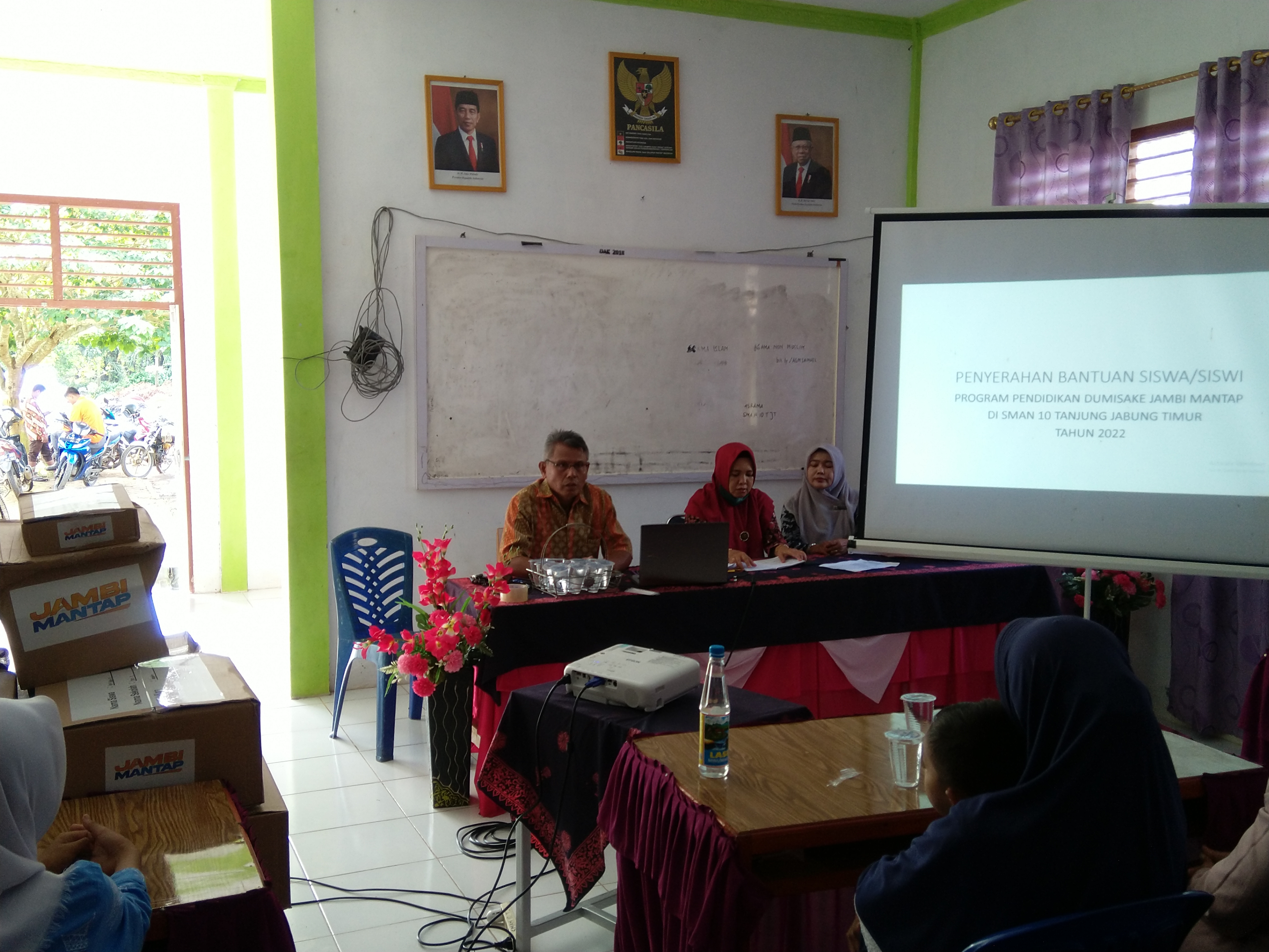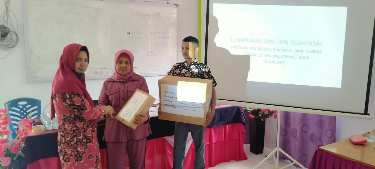 Kepala Sekolah SMAN 10 Tanjung Jabung Timur Yulia ade permanawati, S.Pd menyerahkan bantuan program pendidikan Dua Miliar Satu Kecamatan (Dumisake) pada 15 siswa /siswi di gedung Asrama SMAN 10 Tanjung Jabung Timur, Kamis 02/02/2023.